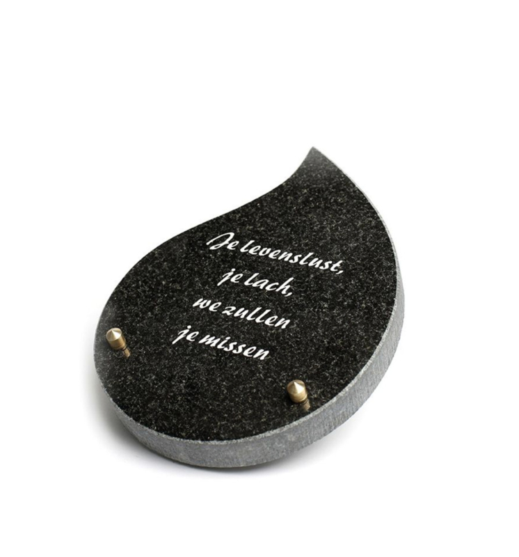 OverzichtGeef een blijvende herinnering met ons traanvormige grafmonumentje van graniet. Dit elegante, kleine monumentje van 15x20 cm is perfect om als aanvulling op bestaande teksten op het graf te plaatsen. Het biedt een intieme manier om je gedachten en gevoelens te uiten, en helpt bij het gedenken van jouw dierbare(n).